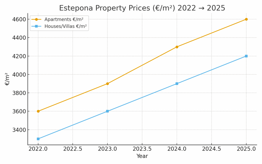 Altos de Estepona: ~€3,673/m² (avg ~€415k).