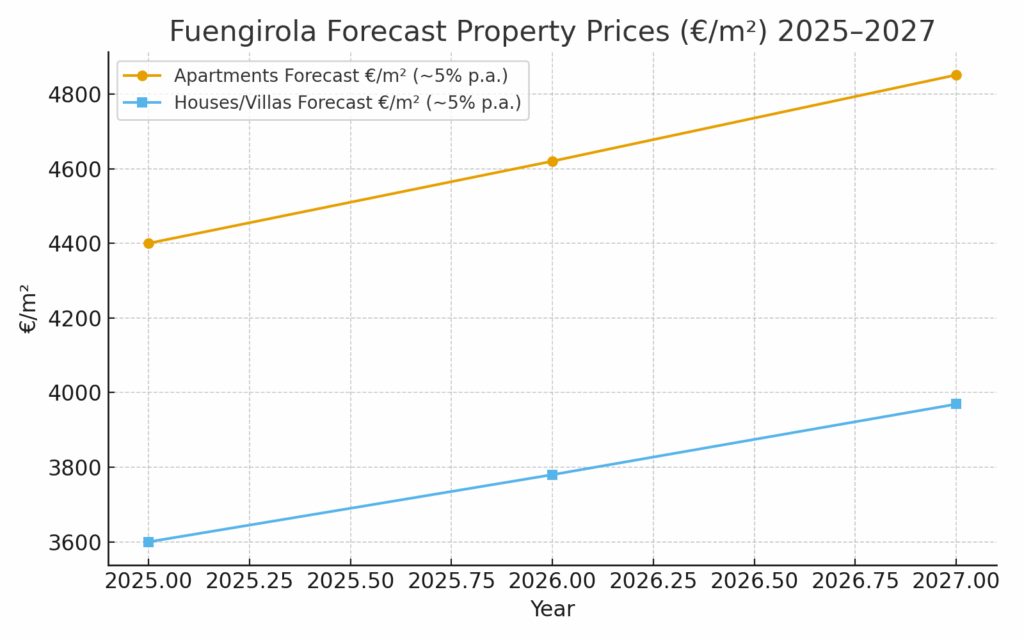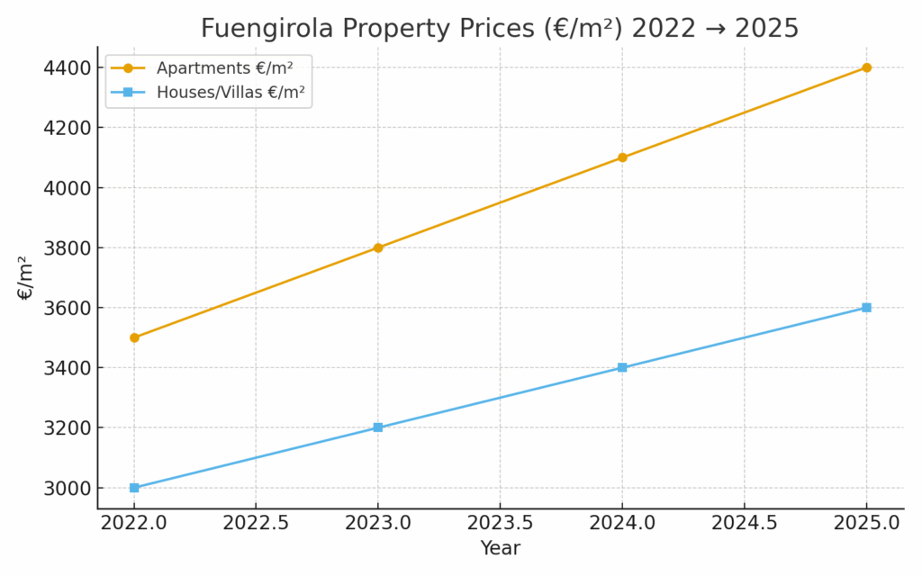 Asking prices in Fuengirola average about €4,600-€5,200/m² in premium coastal zones.