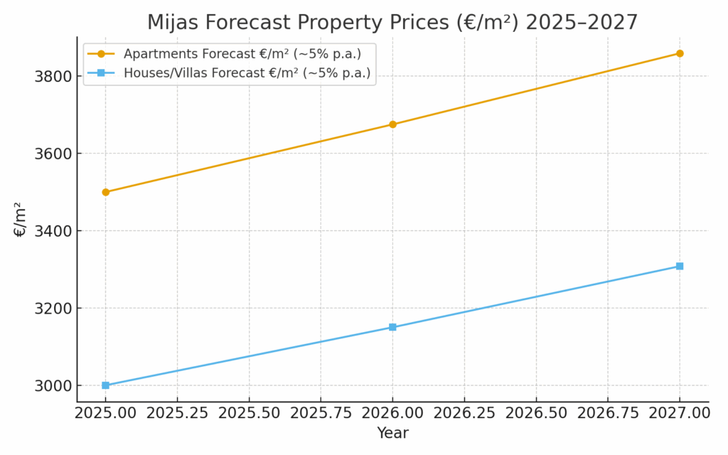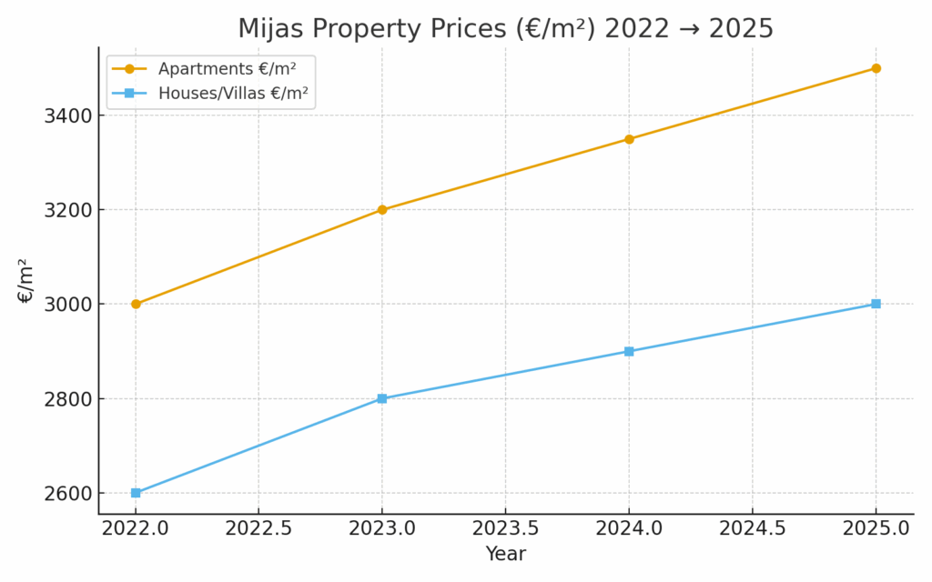 As of 2025, the average asking price for residential properties in Mijas is about €3,853/m², up ~16.8% compared to August 2024.